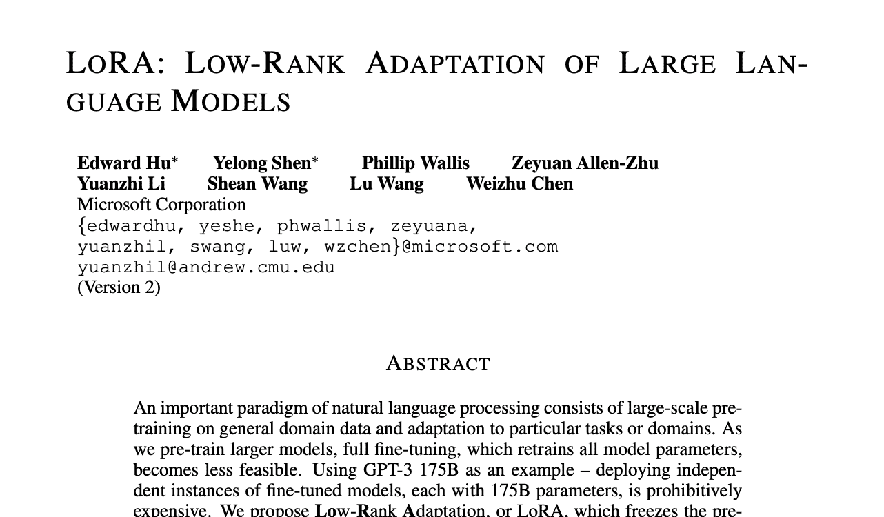 Title and abstract of the low rank adaptation (LoRA) paper