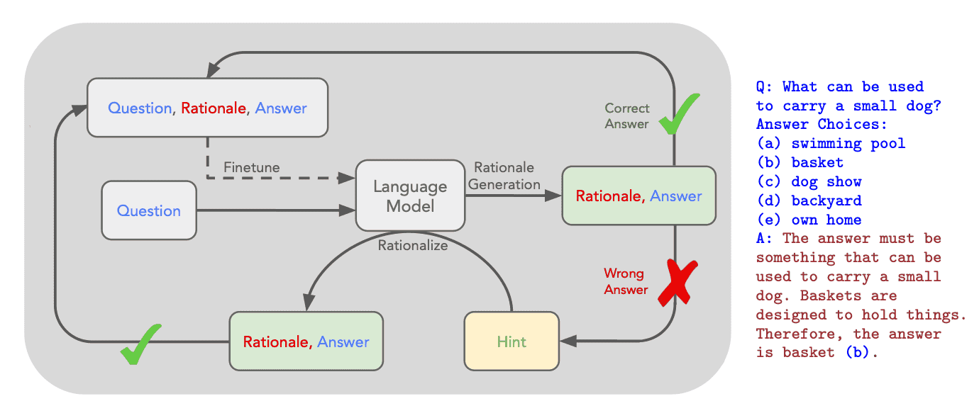 The approach described in the STaR paper shows how using questions with predictable correct answers provides the training data using a CoT approach: