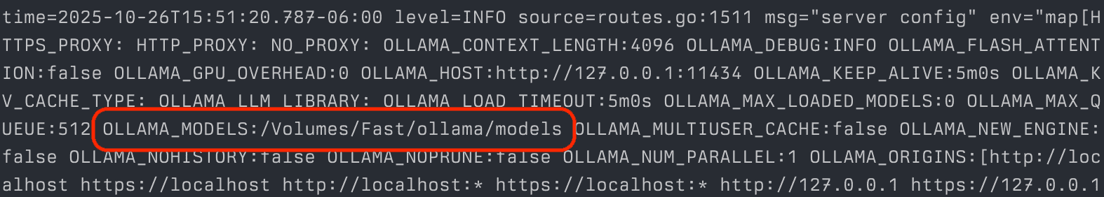 /path/to/your/modelswith your desired location, such as/Volumes/ExternalDrive/ollama/models. On my machine it’s/Volumes/Fast/ollama/modelsbecause my external disk is also, you know, fast!!!