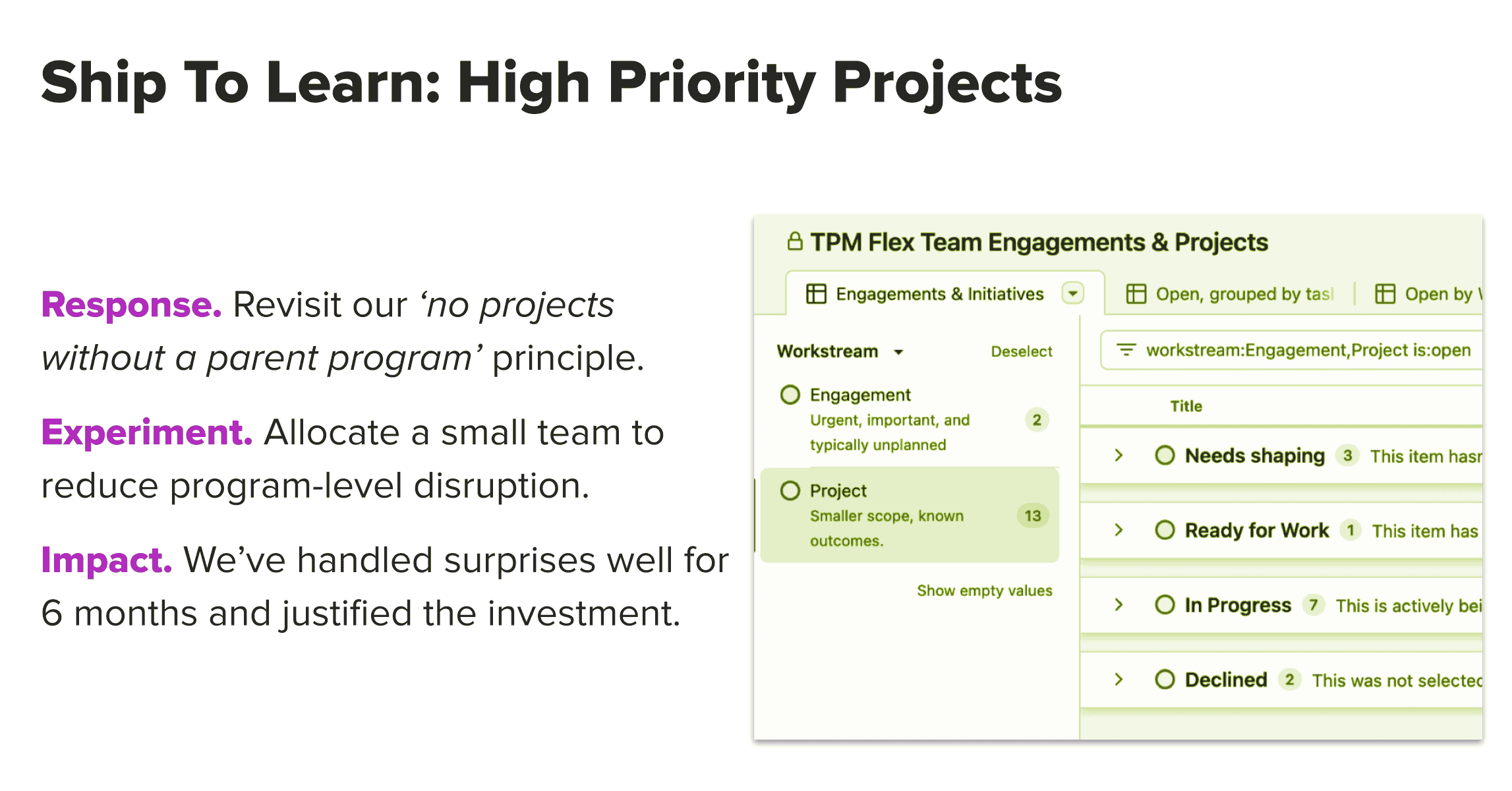 Understanding that the urgent needs wouldn’t go away, I dedicated 3 TPMs (10% of my team’s capacity) to a new entity called The Flex Team for a 6 month experiment.